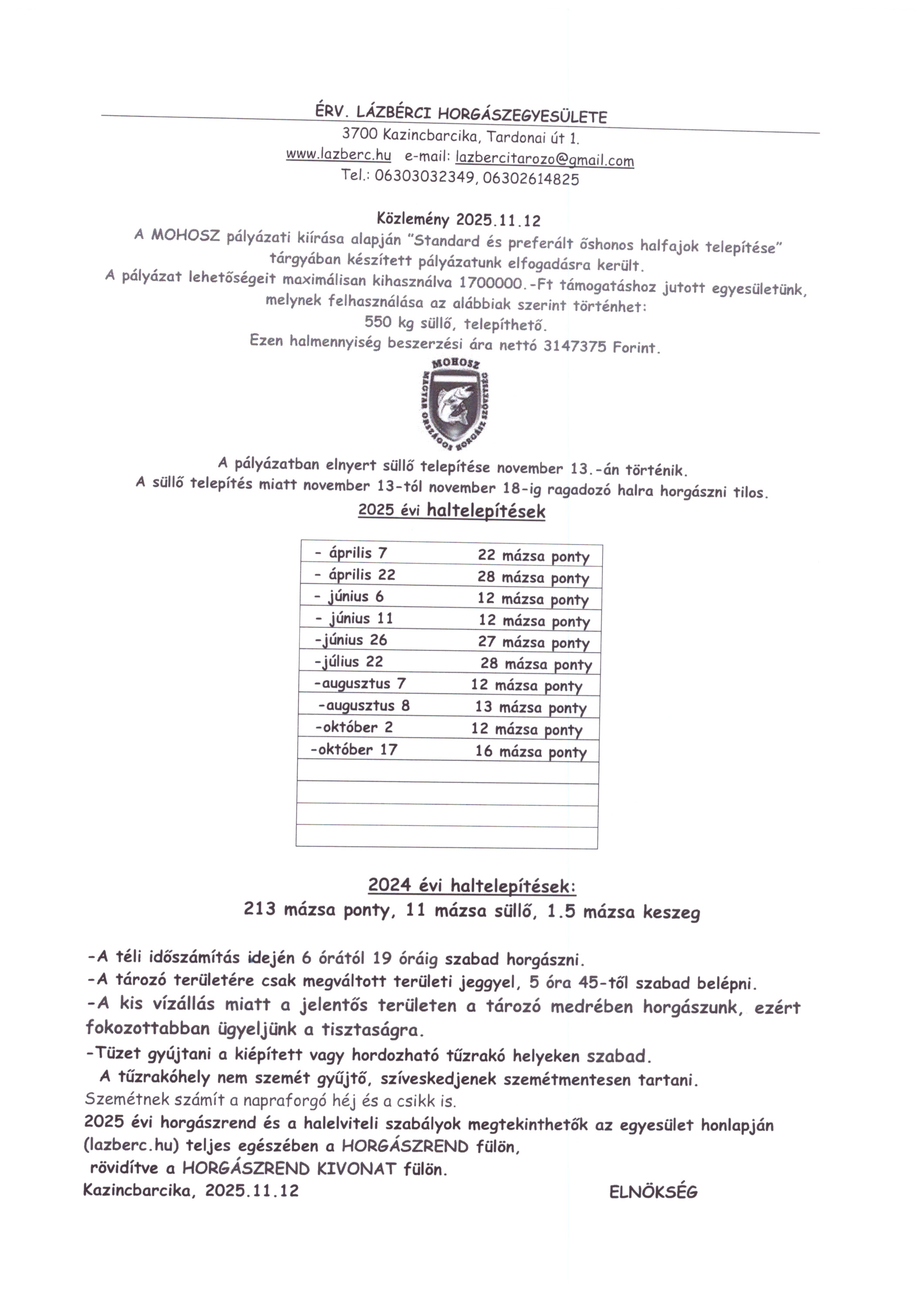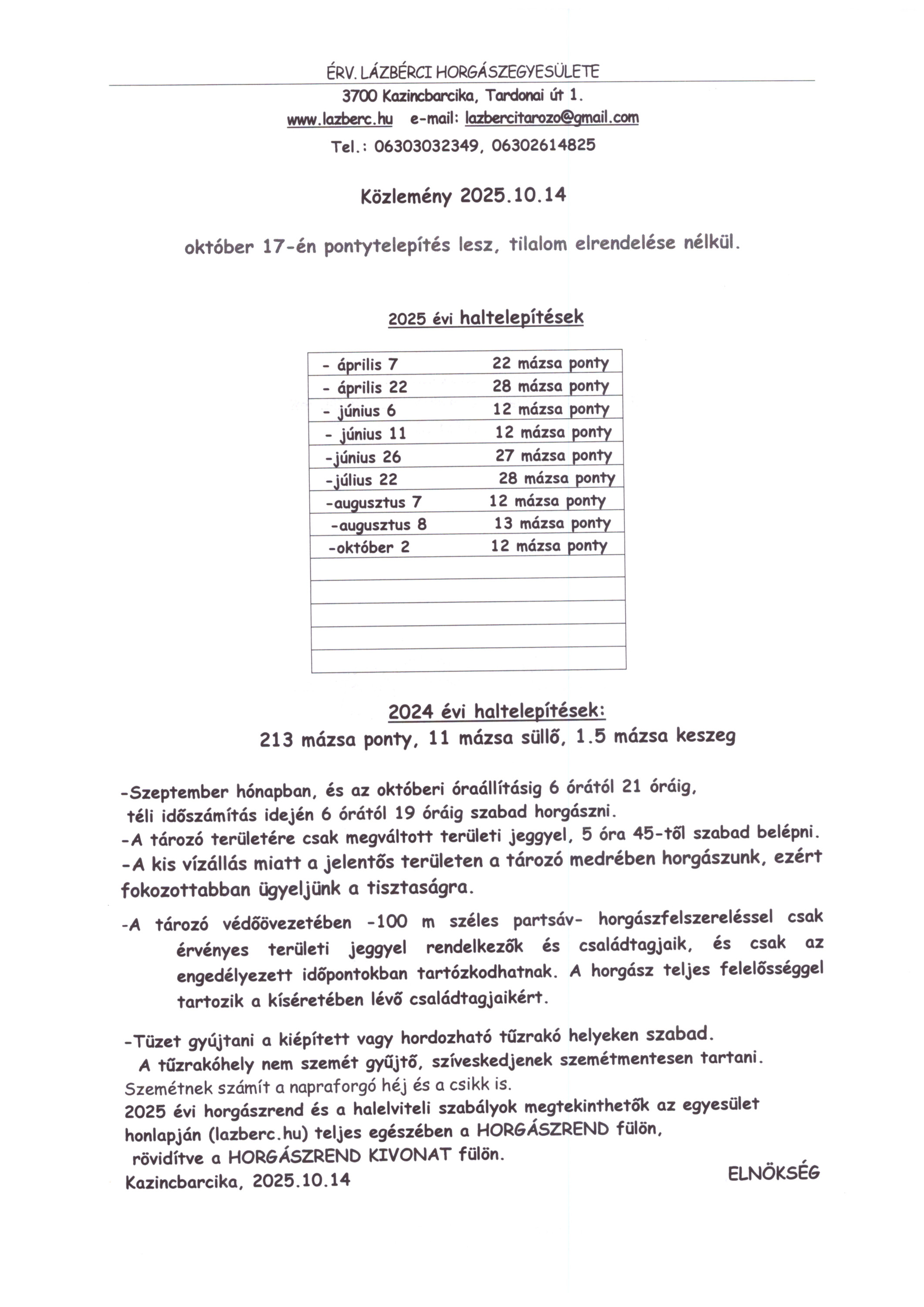 -A 2025 évi horgászrend és a halelviteli szabályok megtekinthetők az egyesület honlapján (lazberc.hu) teljes egészében a HORGÁSZREND fülön,